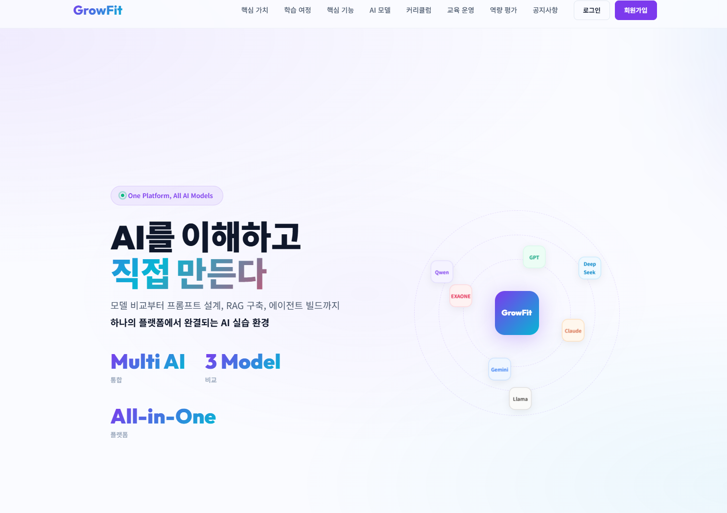 GPT, Claude, Gemini를 한 화면에서 비교 실습하고, 프롬프트 엔지니어링부터 RAG 지식베이스, AI 에이전트 빌드까지 — 7개 모듈로 구성된 AI 실습 플랫폼입니다. 훈련 운영기관이 별도 개발