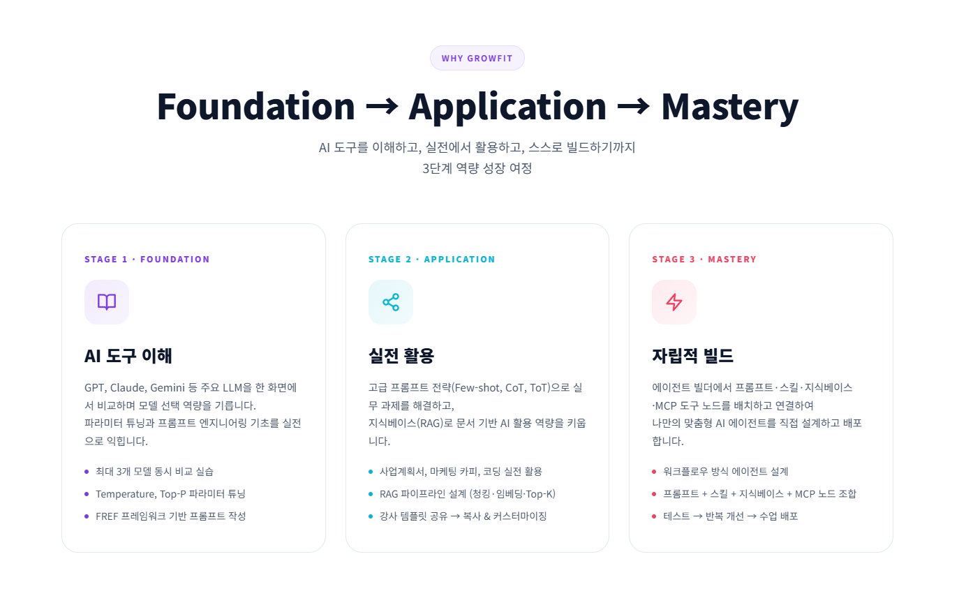 GrowFit 플랫폼을 처음 접하는 강사와 학생 모두를 위한 표준 매뉴얼이 완성되었습니다. 회원가입부터 5단계 AI 학습 체계, 강의 운영 도구, 수업 활용 시나리오까지 — 플랫폼의 모든