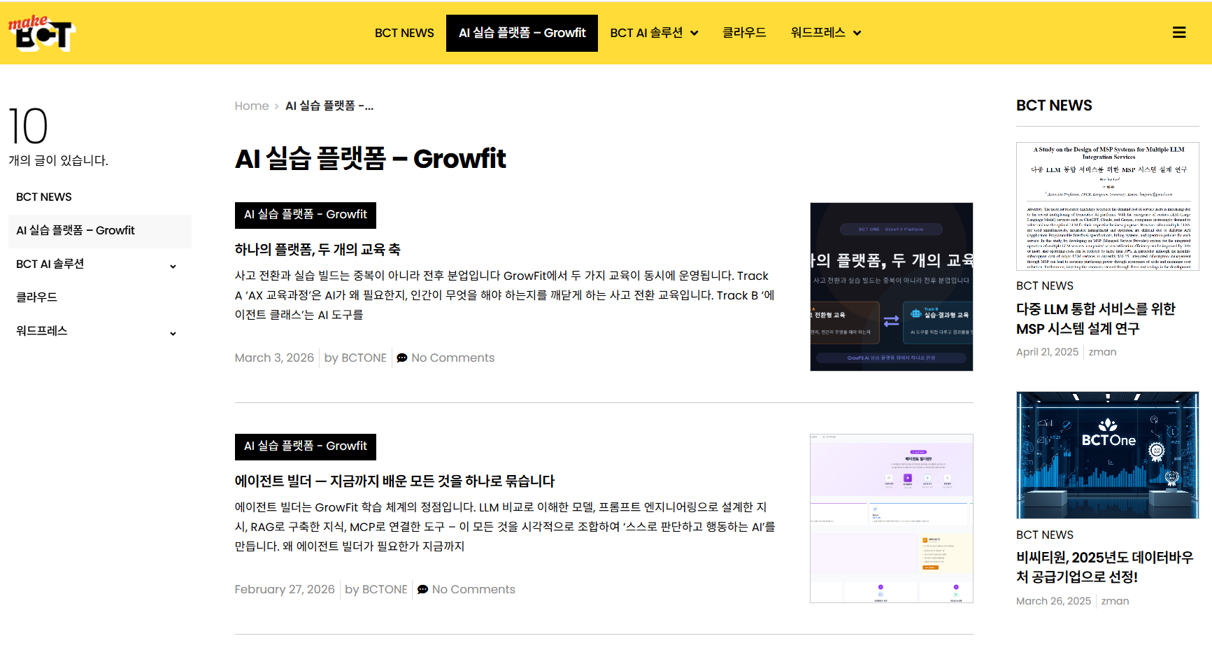 비씨티원이 자사 매거진 MAKE BCT에서 AI 실습 플랫폼 GrowFit의 개발 과정, 교육 설계 철학, 플랫폼 기능을 심층적으로 다루는 콘텐츠 연재를 시작했습니다. 비씨티원은 자체 개발 AI
